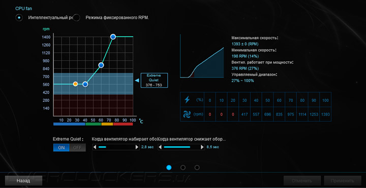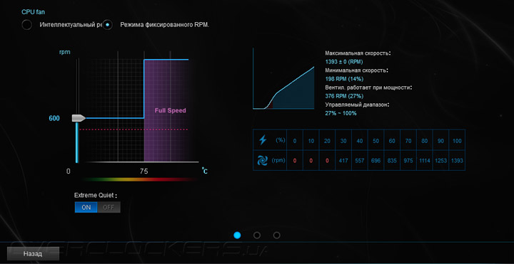 Старшая на сегодня версия Fan Xpert позволяет использовать низкие обороты охладителей в более широком диапазоне, имеющим вид таинственных процентов. После калибровки устройств можно сформировать затейливый алгоритм их работы или же зафиксировать обороты на желаемом уровне до момента разогрева процессора до 75 °C, когда вентиляторы начнут работать на максимальной скорости.