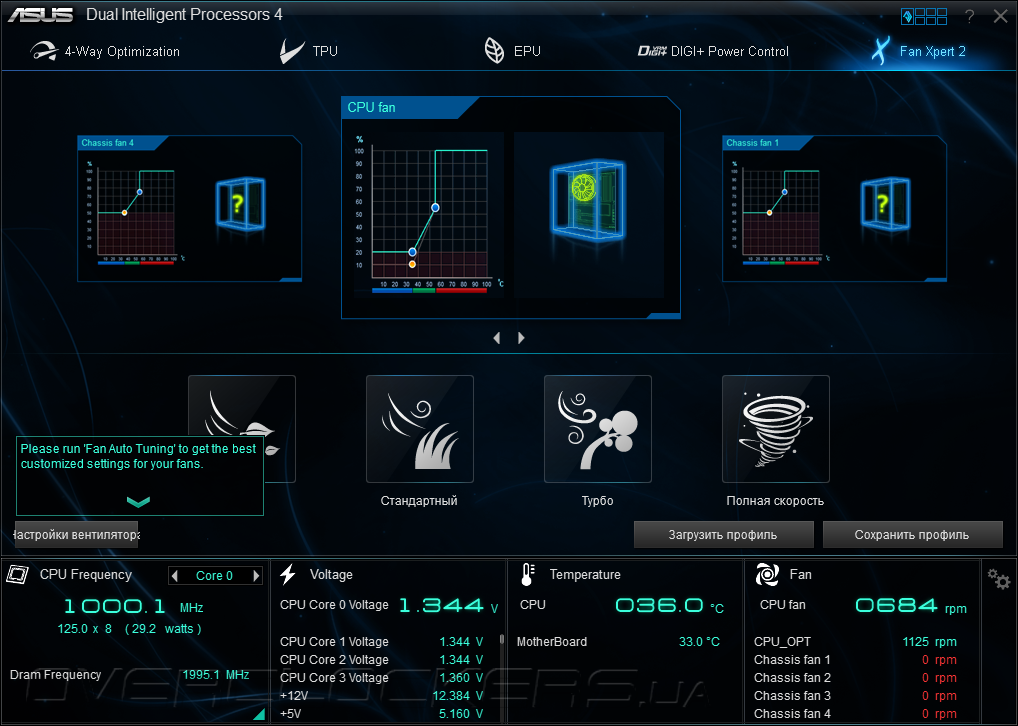 Раздел Fan Xpert 2 предназначен для подробной настройки профилей вращения вентиляторов в системе. Для удобства и наглядности представлены графики зависимости скоростей вращения от температуры для каждого набора настроек.