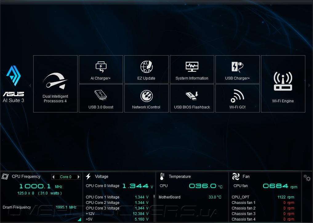 Итак, основной инструмент по настройке системы из ОС — это обновлённый программный пакет ASUS Ai Suite 3. В нижней части всегда находится раздел мониторинга в независимости от активной вкладки, что очень удобно.