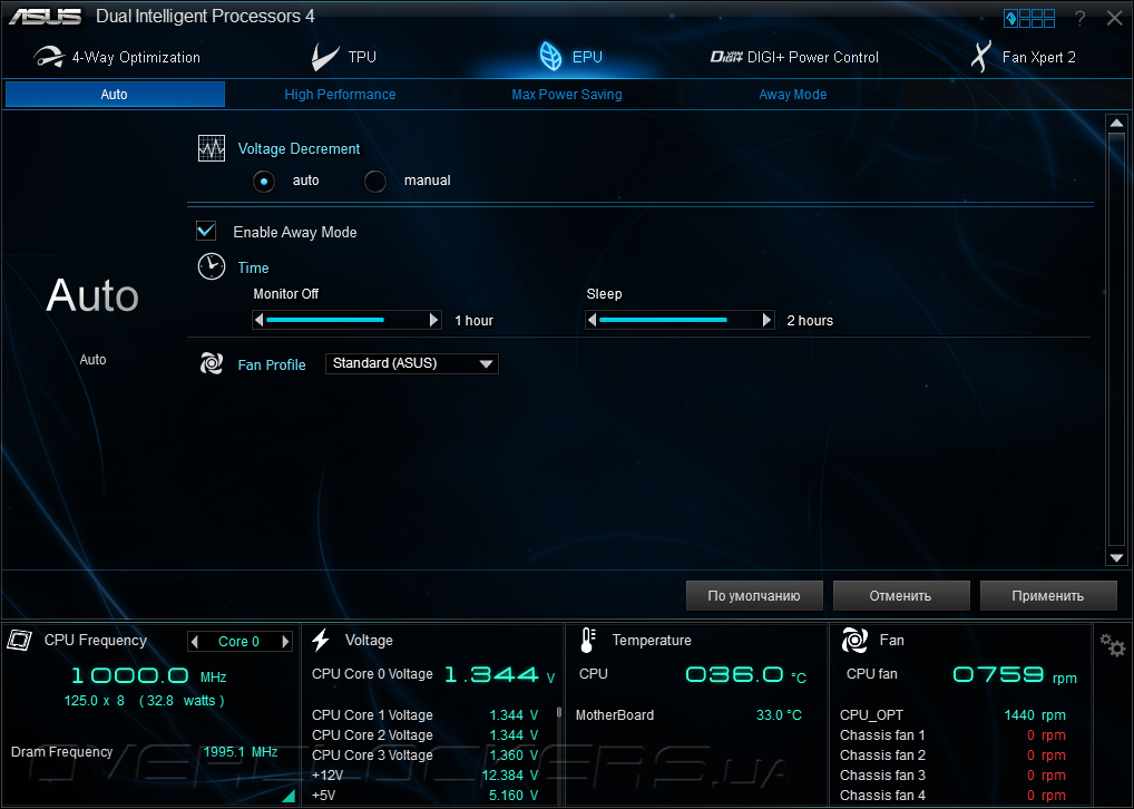 Раздел EPU отвечает за настройку профиля вращения вентиляторов, параметры спящего режима и здесь же можно настроить каждый из трёх профилей работы системы, а именно режима максимальной производительности, максимального энергосбережения и режима Away Mode, когда пользователь отошёл и ПК полностью простаивает.