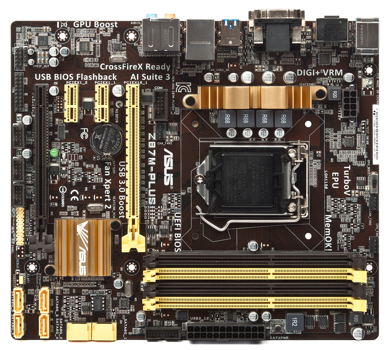 Помимо этого, именно Z87M-Plus является наиболее предпочтительной для энтузиастов с ограниченным бюджетом, поскольку обладает несколькими специфическими способностями — кнопкой MemOK! и переключателем состояний работы GPU Boost. Во всём остальном это самая обыкновенная плата, не отягощённая какими-то дополнительными контроллерами интерфейсов, но в то же самое время обладающая всем необходимым для построения современного мультимедийного компьютера.