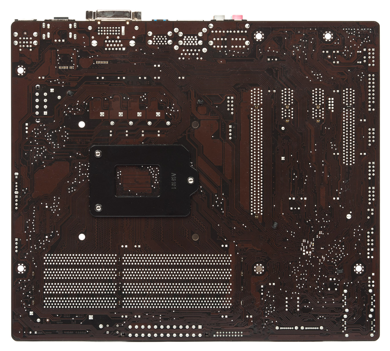 Простота устройства сказывается и на его обратной стороне, где нет сторонних элементов, в частности, в области размещения усилительной пластины охладителя ЦП. Радиаторы на плате закреплены при помощи подпружиненных пластиковых защёлок.