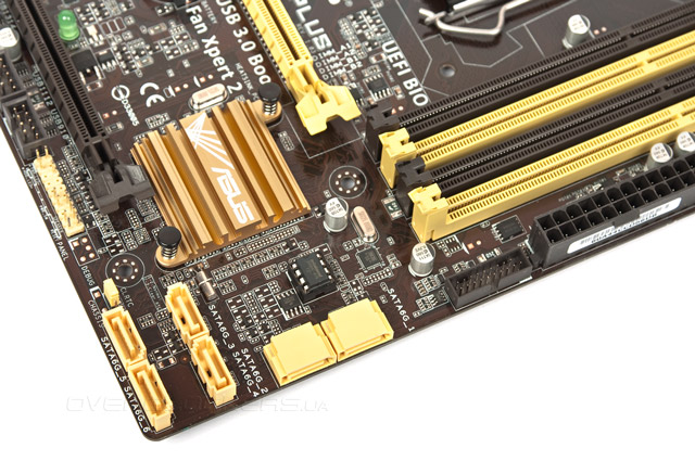 Унификация производства приводит к использованию одинаковых элементов на разных устройствах; охладитель чипсета абсолютно такой же, как на прежде рассмотренной H87I-Plus, хорошо справляющийся со своими обязанностями. Четыре обыкновенных гнезда SATA заняли своё место в углу, а чуть выше них, в области размещения видеоускорителя, находятся ещё два продольного исполнения. Слоты под оперативную память оснащены защёлками лишь с одной стороны, что придаст комфорта при эксплуатации системы.