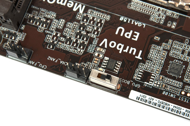 Второй из двух вентиляторных разъёмов находится у верхней грани платы, рядом с процессорным. Все три имеют четырёхконтактное исполнение, а процессорный лишён датчика-идентификатора типа подключаемого устройства, равно как это было и на H87I-Plus. В противовес последнему, здесь находится любопытный переключатель GPU_BOOST. Забегая наперёд отмечу, что его роль равноценна TPU — одного из «интеллектуальных процессоров», включенных в состав старшего продукта — Z87-Plus. Иными словами, при его использовании активируются функции по автоматическому разгону всех компонентов системы, а не только графического модуля, входящего в состав процессоров Intel Haswell, как это подразумевает его именование. Одновременно рядом с ним загораются зеленый или оранжевый светодиод, в зависимости от положения переключателя, и — как следствие — используемого профиля.