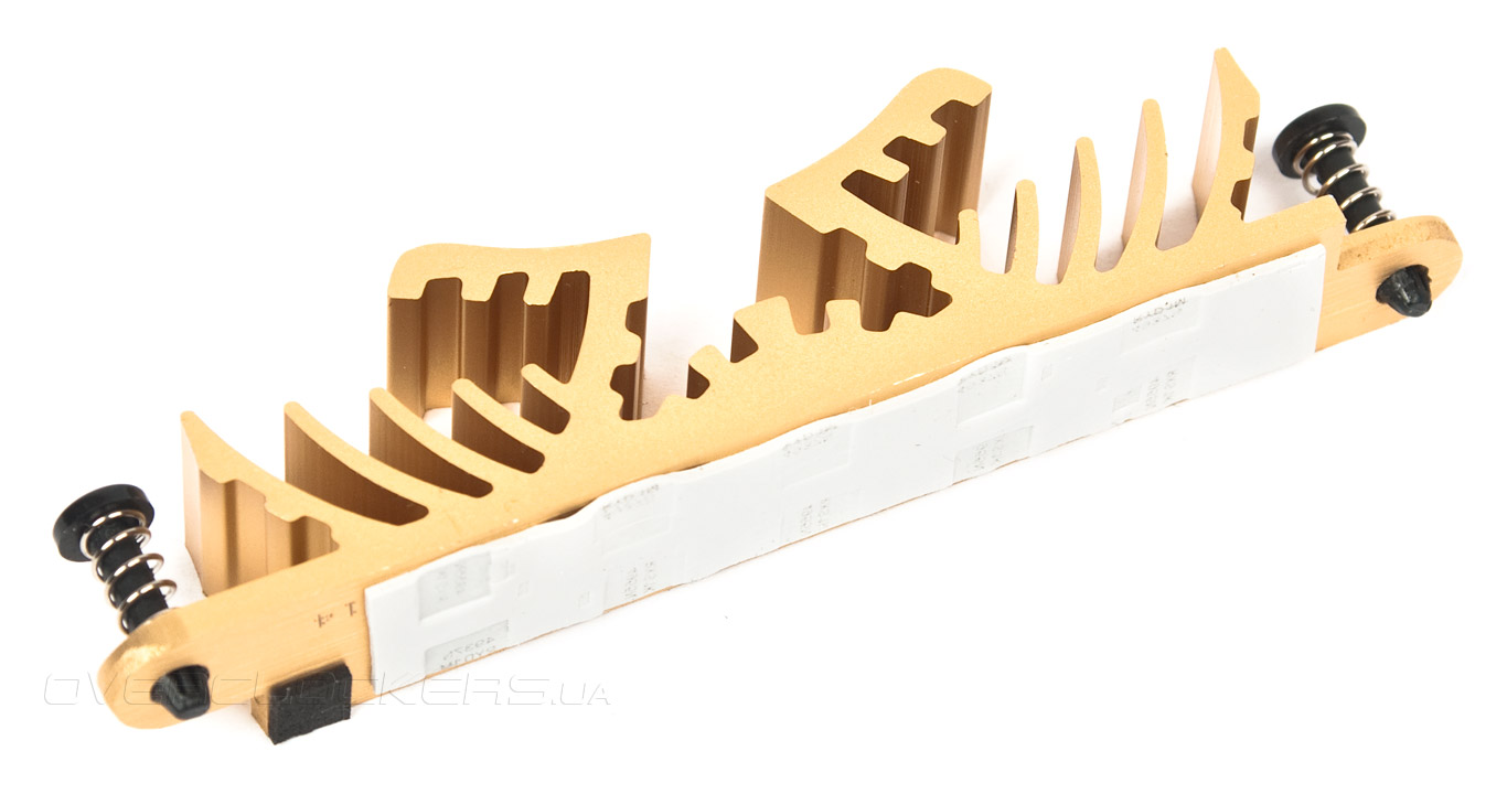 Радиатор лёгок, его прижим неказист, а на термопрокладке тоже не постеснялись сэкономить. Немногочисленные силовые элементы не имеют полного контакта поверхности вместе с ней.