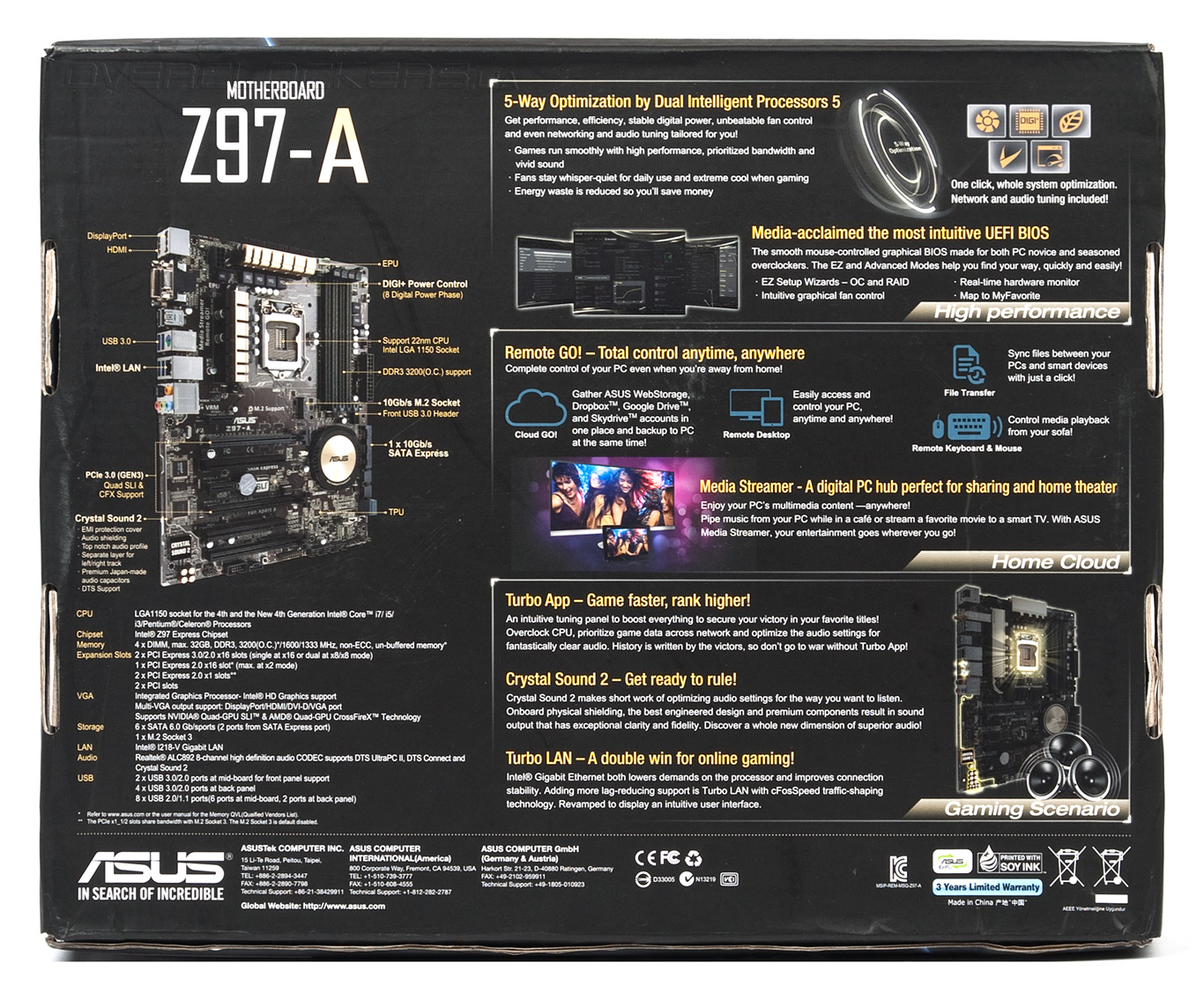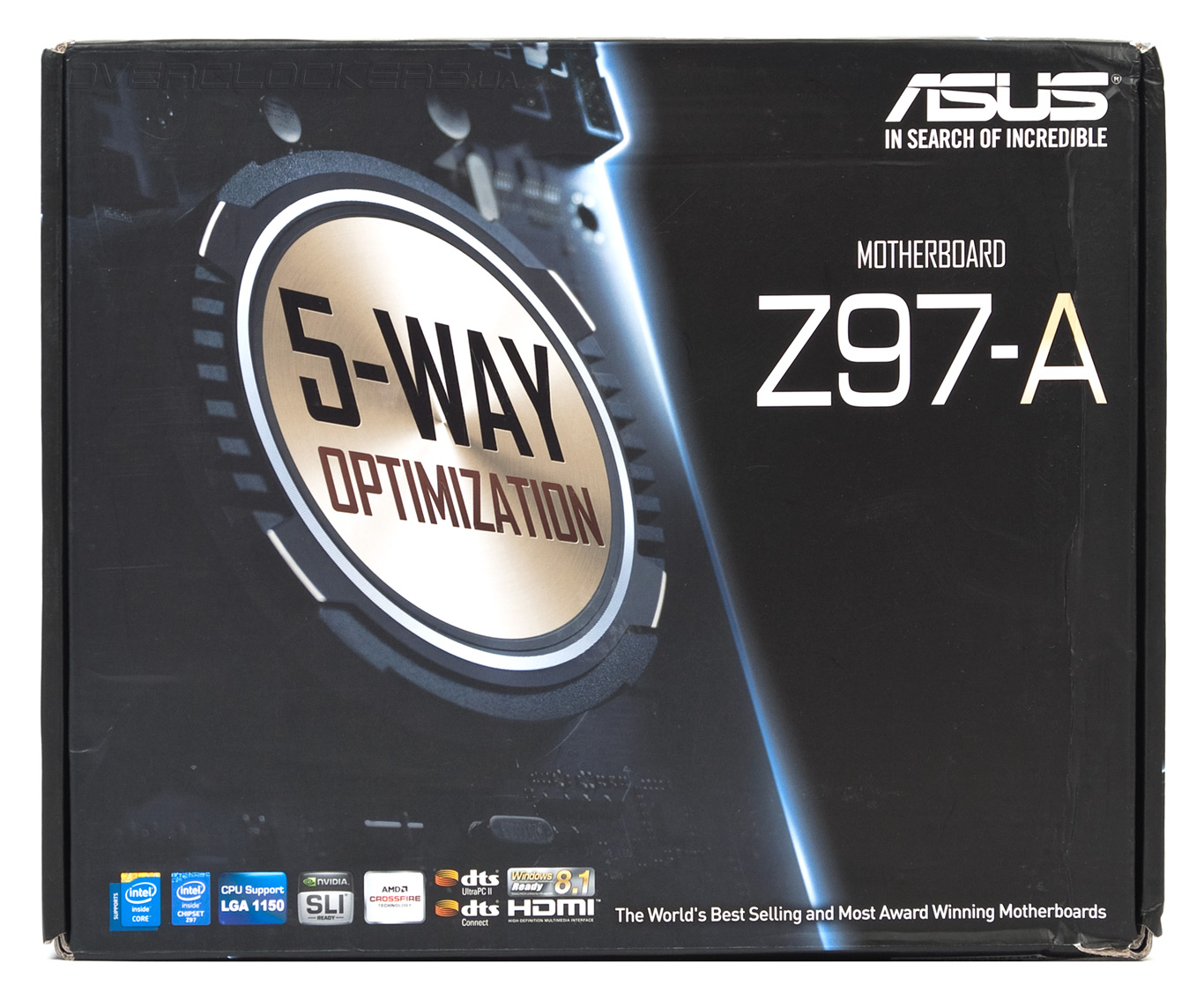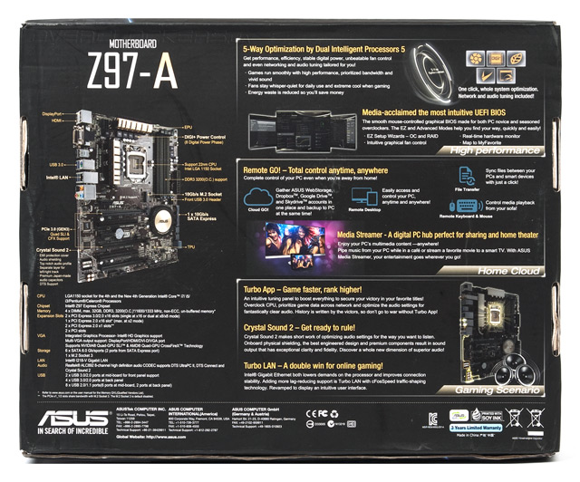 Собственно, под оптимизацией следует понимать возможность использования комплекса из пяти утилит, входящих в состав Ai Suite 3, а точнее одного из модулей — Dual Intelligent Processors 5. Прочие утилиты, входящие в его состав, указаны на обратной стороне упаковки с кратким пояснением сути привносимых изменений или обретаемых компьютером новых возможностей. Кроме программной составляющей не была позабыта и аппаратная: полноценное фото устройства и таблица со спецификациями позволит оценить возможности Z97-A без вскрытия упаковки или визита на официальную страницу продукта в Сети.