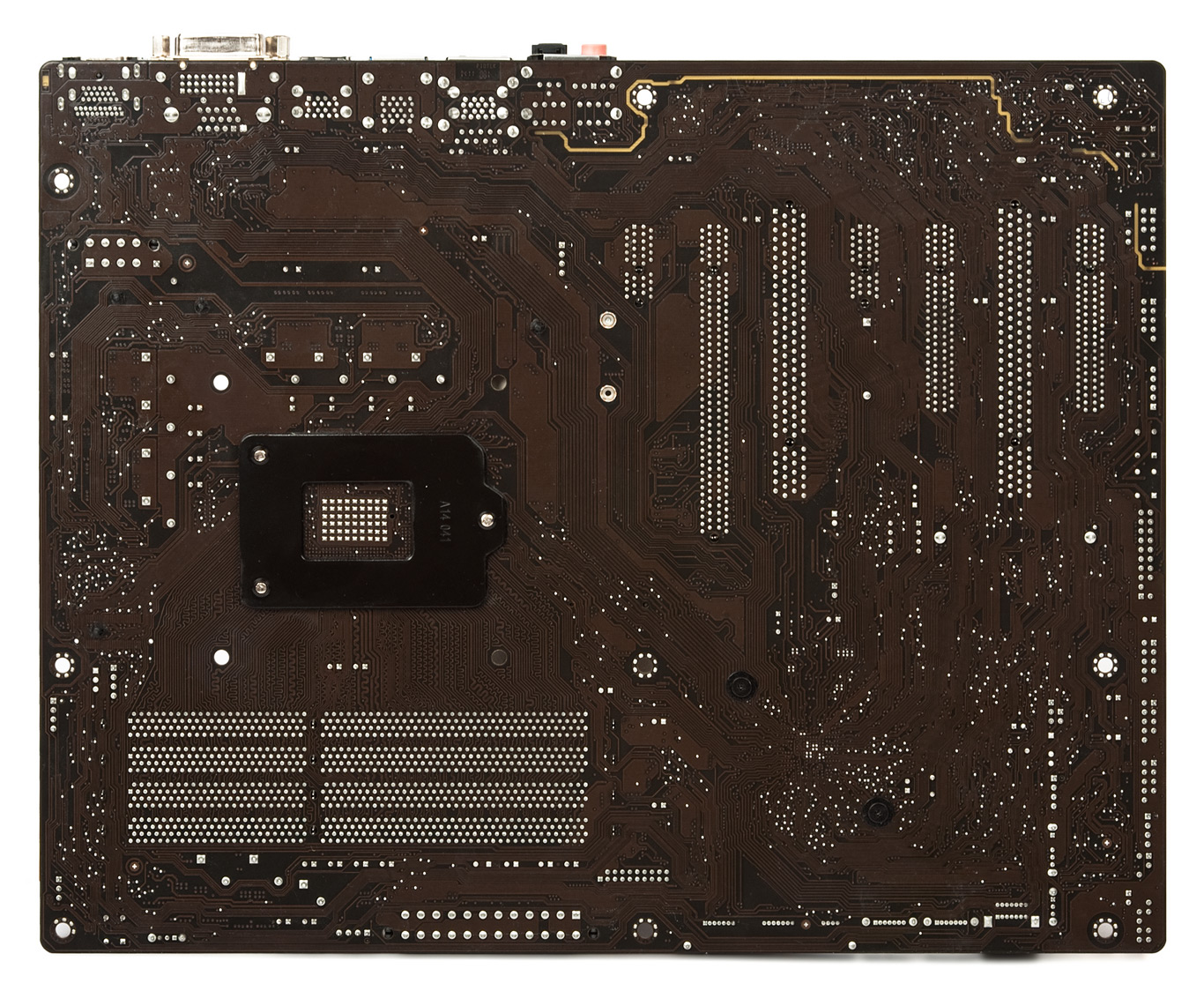 Обратная часть изделия освобождена от электронных компонентов. Нехитрые радиаторы силовых элементов используют подпружиненные пластиковые гвозди для своего крепления, а охладитель чипсета надёжно зафиксирован винтами.