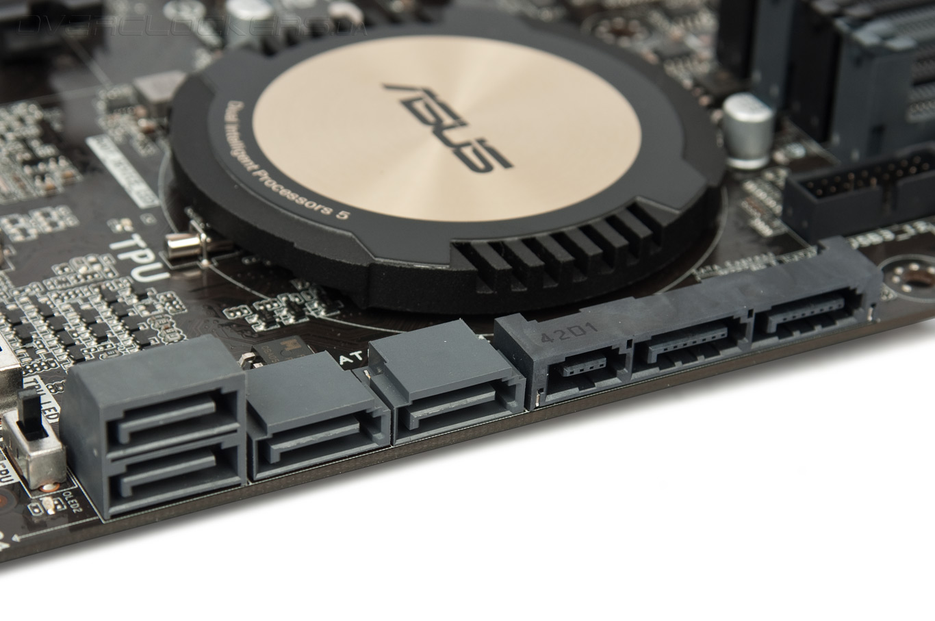 Проблем с идентификацией порядковых номеров выходов интерфейса SATA не возникает. Пятый и шестой по счёту внедрены в состав SATA Express. Все их корпуса расположены вдоль поверхности PCB. Какие-либо сторонние контроллеры здесь отсутствуют.
