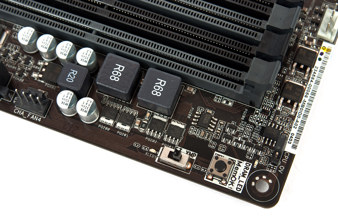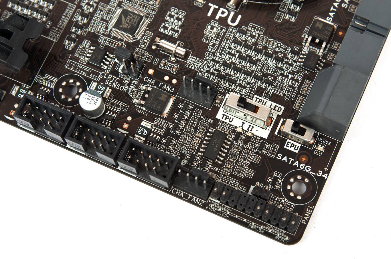 DRAM_LED находится рядом с кнопкой MemOK!, справа в верхнем углу изделия. Здесь же обнаруживается невиданный прежде переключатель EZ_XMP, активирующий профиль XMP без участия пользователя в процедуре настройки системы посредством UEFI. В этом случае процесс активации подтверждается зелёным светодиодом, заботливо распаянным здесь же. Небольшое удивление вызывает наличие контактной группы CPU_OV, видимо, специально для тех пользователей, которые решат начать свои экстремальные эксперименты с простого продукта, не прибегая к покупке чего-то более подходящего.