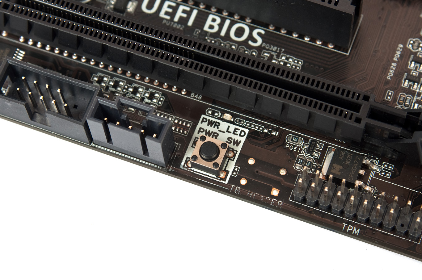 Также Z97-A не обошлась и без индикатора включения системы, который расположен вновь у соответствующей кнопки PWR_SW — буквально на нижней границе платы. Рядом находится гнездо TB_HEADER, которое пригодится тем, кто захочет оснастить свою плату самым скоростным на сегодня интерфейсом; подобное возможно при покупке карты ThunderboltEX II, причём Z97-A является самой младшей моделью на момент написания обзора, позволяющей подобное расширение возможностей системы.