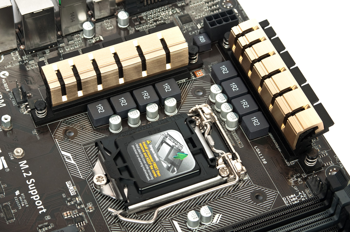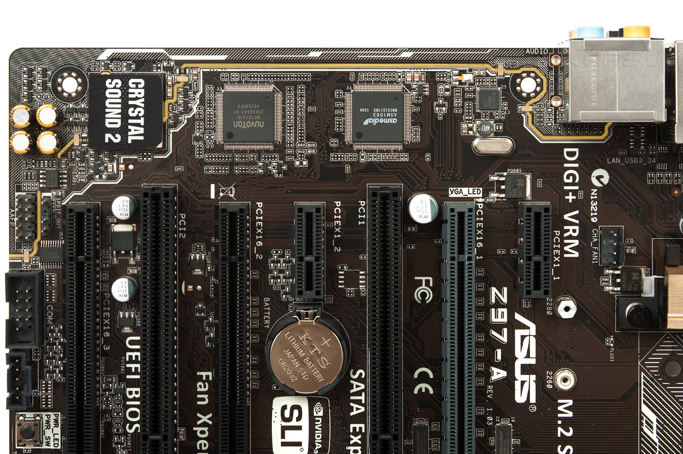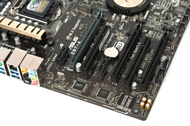 Подход к реализации узла VRM сохранён из прошлой серии; тогда у моделей Z87-Plus и Z87-A он был единым. Кроме того, отмечу здесь наличие коммутатора ASM1440, чья роль сводится к распределению приоритета в использовании гнезда M.2 или двух самых простых PCI-E.