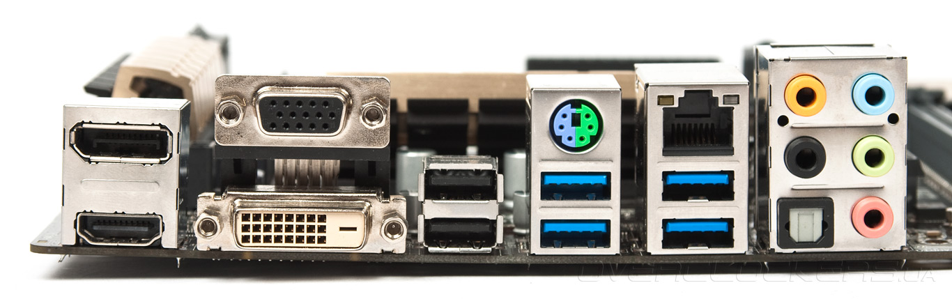 Задняя панель у прошлого поколения вызывала ряд замечаний. В этот раз её концепция существенно пересмотрена, и теперь пожаловаться можно лишь на близкое соседство DVI-D и гнёзд USB. Но если учесть вероятное привлечение последних для нужд интерфейсных кабелей, то проблем возникнуть не должно. В остальном она близка к эталону, которым с недавних пор я стал считать GA-Z97X-SOC Force. Видимо не так просто было разместить здесь четыре гнезда USB второй ревизии, а в остальном всё отлично. Традиционно не обошлось без участия конвертера уровней ASM1442.