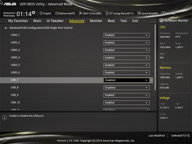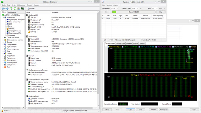 Благодаря обширным возможностям UEFI удалось выяснить, что всё дело в двух обыкновенных гнёздах USB 2.0, расположенных на задней панели. Вне зависимости от их привлечения к эксплуатации, сообщение появлялось вновь и вновь, поэтому пришлось их отключить. Сложно сказать, тому виной дизайнерские просчёты в проектировании или же это проблема конкретного экземпляра Z97-A. Как бы там ни было, после этого всё работало без вопросов. При повышенном до 1,9 В общем напряжении питания ЦП, для кольцевой шины — до 1,3 В, а на вычислительных блоках — до 1,35 В, Core i5-4670K смог заработать на частоте 4,7 ГГц, а кольцевая шина при этом — на 4,4 ГГц.