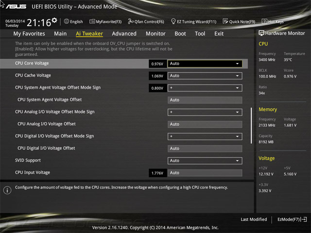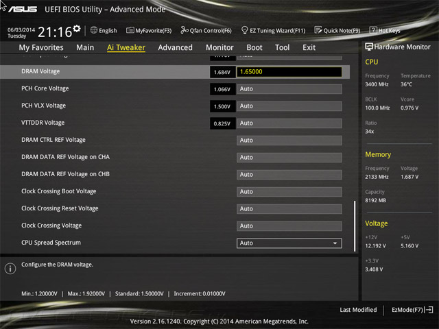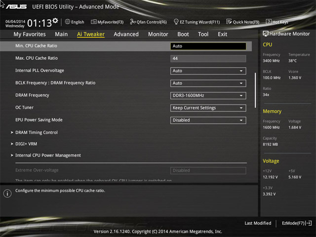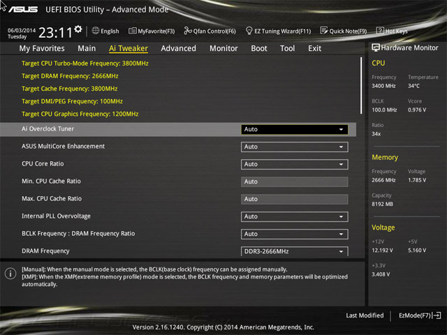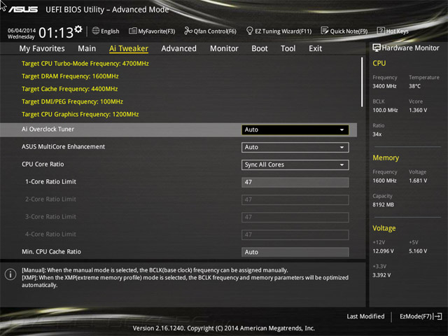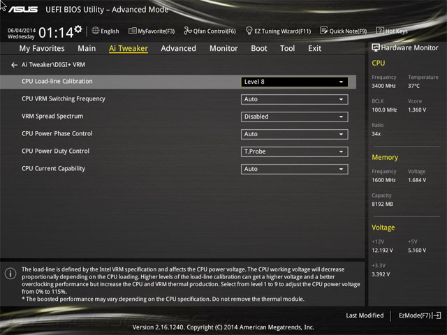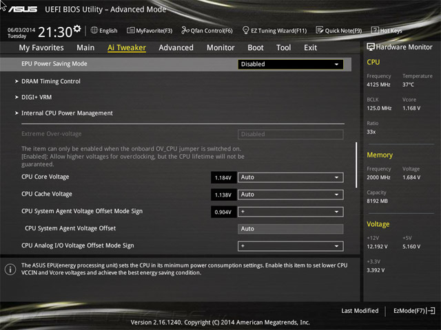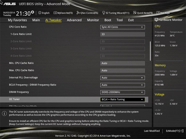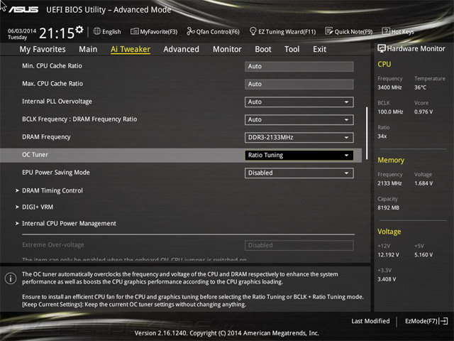 Ещё два режима автоматического разгона всё так же можно активировать внутри UEFI, или же прибегнув к функционалу на PCB в виде переключателя состояний TPU. В любом из случаев первый режим, именуемый ныне Ratio Tuning, оказывается весьма знакомым про изделиям прошлого поколения, изготовленных с применением Intel Z87. При его использовании процессор функционирует на частоте немногим выше 4 ГГц, при этом видимого увеличения напряжения не происходит. Оперативная память функционирует согласно профилю XMP — частота составляет 2133 МГц.