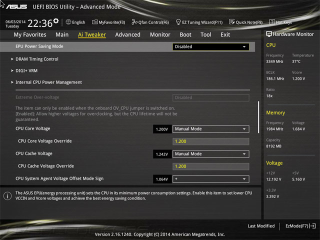 Фирменным решением производителя в сфере увеличения энергоэффективности является активация EPU. На этот раз поведение Z97-A практически совпало с его предшественником в лице Z87-Plus. Напряжение питания вычислительных блоков всеми силами удерживалось на границе 1,01 В, частота ЦП составляла 3,6 ГГц весьма недолгое время, снижаясь до штатного значения (3,4 ГГц) в особенности при нагрузке, занимающей продолжительный период времени. Такие мероприятия позволяют снизить итоговый уровень потребления до 79–137 Вт.