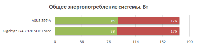 Продолжая рассуждать о едином поведении устройств при идентичных параметрах, нельзя не отметить их абсолютно одинаковый уровень потребления электрической энергии. Можно было бы констатировать весьма энергоэффективный модуль VRM в составе Z97-A, но его странное поведение при разгоне не позволяет этого сделать. Обозначенный разделом выше граничный порог в 99 Вт для режима бездействия не является окончательным числом. Долгое время после процедуры стресс-тестирования он оказывается именно таким, но если хорошенько подождать (более десяти минут), то постепенно аппетиты системы начинают угасать, снижаясь в числовом эквиваленте до ожидаемых 88 Вт. Повторные эксперименты лишь повторяли такой сценарий развития событий.