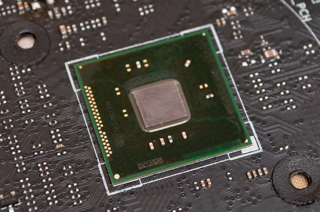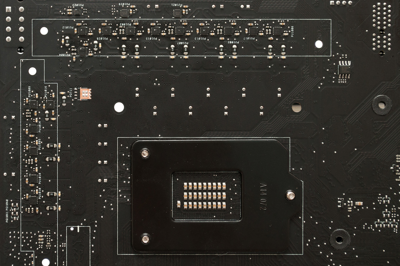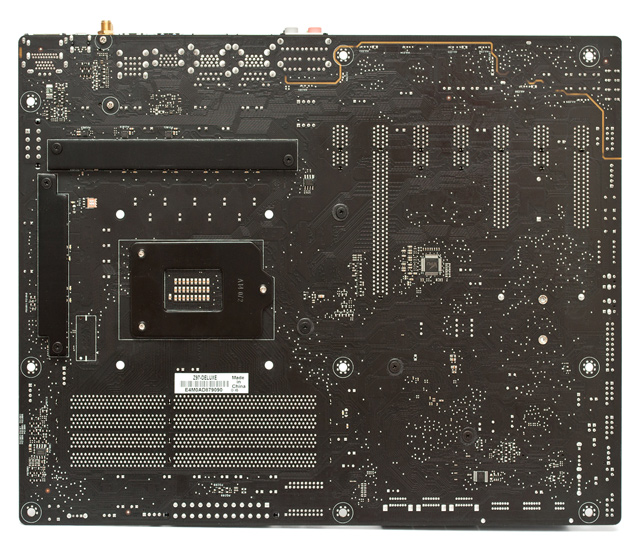 С обратной стороны материнской платы в районе процессорного разъема видны две металлические пластины, являющиеся частью системы охлаждения VRM. Их размеры и конфигурация таковы, что они не должны препятствовать установке массивных кулеров, без которых невозможен полноценный разгон Intel Haswell.