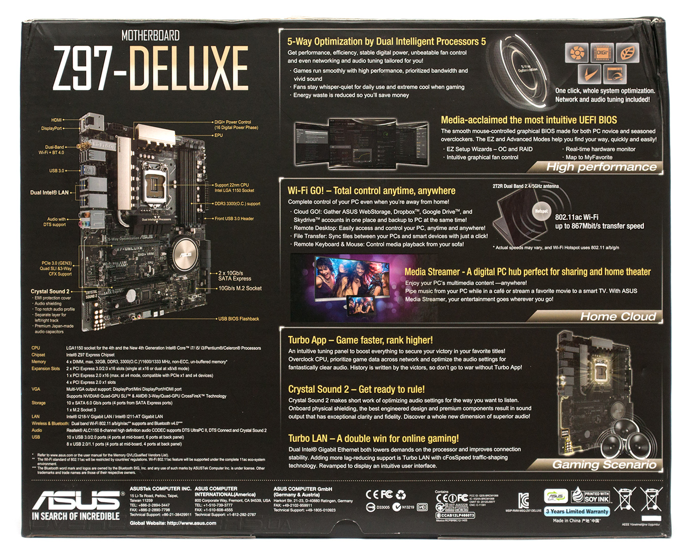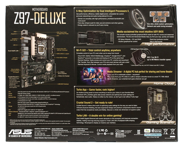Комплект поставки хорош, но все-таки, от продукта со словом Deluxe в названии модели невольно ожидаешь чего-то большего. Отмечу, что на рынке существует модификация ASUS Z97-Deluxe(NFC & WLC), которая оснащена коммуникационным модулем NFC, совмещенным с беспроводной зарядкой WLC.