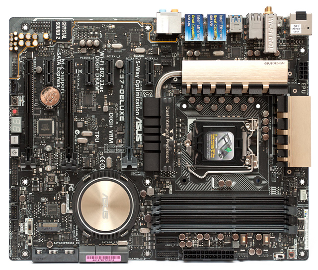 Полная идентичность функций и возможностей расширения «новых» и «старых» PCH наводит на мысль, что чипмейкер ограничился сменой маркировки, тогда как физически это, скорее всего, одни и те же микросхемы. Тем не менее, производители системных плат положительно восприняли инициативу «силиконового гиганта» и воспользовались возможностью обновить продуктовые линейки. Одной из первых в нашу тестовую лабораторию попала ASUS Z97-Deluxe, основанная на чипсете Intel Z97.
