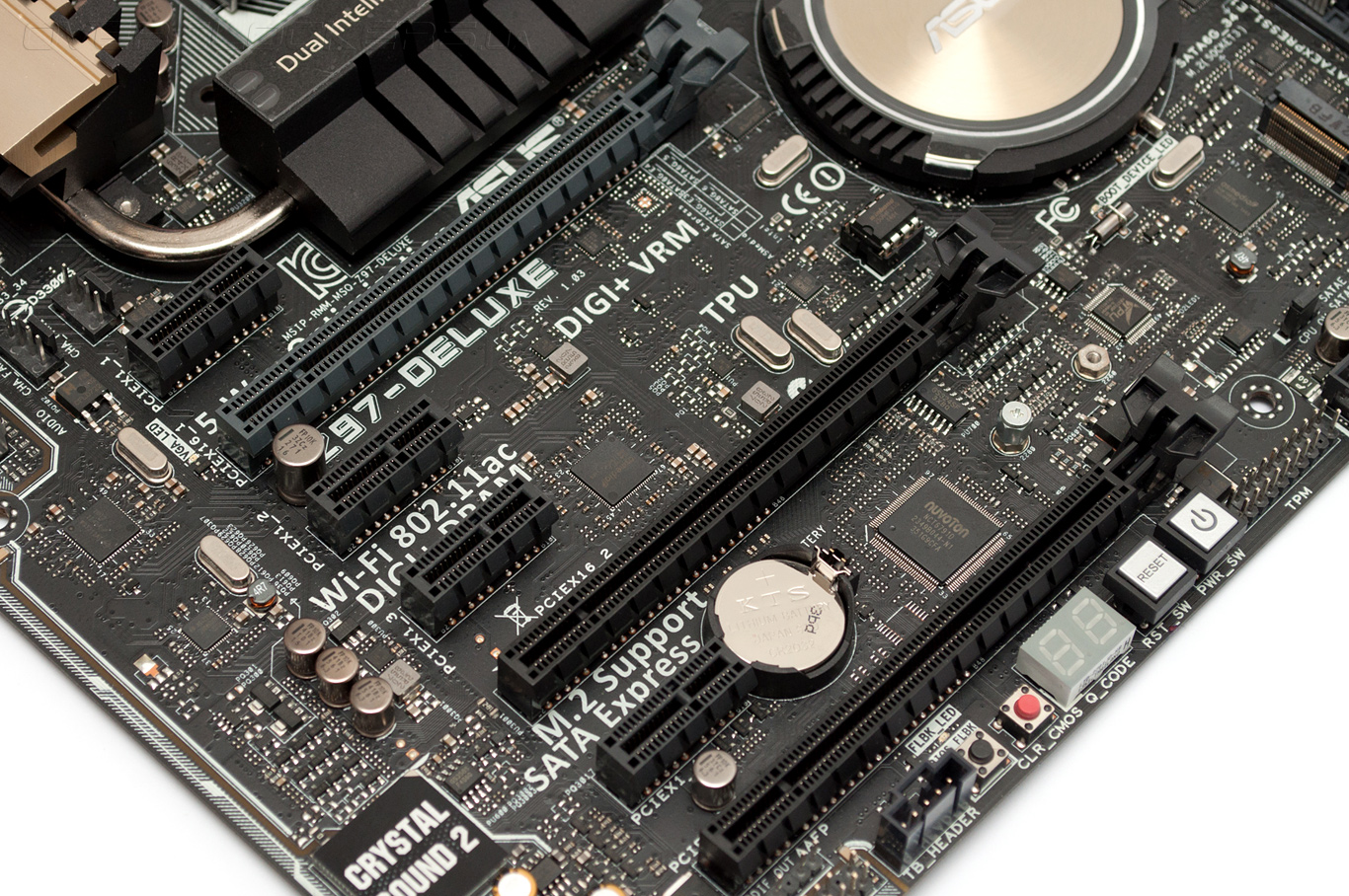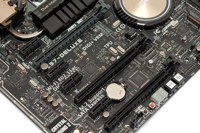 Героиня сегодняшнего обзора оснащена четырьмя слотами DIMM для установки модулей ОЗУ стандарта DDR3 суммарным объемом до 32 ГБ включительно. Благодаря использованию технологии T-Topology производитель заявляет поддержку рабочих частот оперативной памяти до 3300 МГц. Для организации графической подсистемы ASUS Z97-Deluxe располагает парой разъемов PCI Express 3.0 x16, которые могут работать в режимах «x16+x0» и «x8+x8», обеспечивая функционирование конфигураций AMD CrossFireX и NVIDIA SLI. Третий слот PCI Express 2.0 x16 подключен к чипсету, он работает в режиме x16@x4. Его можно использовать для установки третьей видеокарты, или платы расширения, требовательной к пропускной способности интерфейса. Помимо того, для установки дополнительных контроллеров предназначены четыре разъема PCI Express 2.0 x1, а для обеспечения одновременной работы этих слотов и многочисленных встроенных устройств на плате используется восьмипортовый коммутатор линий PCI-E ASMedia ASM1187e.