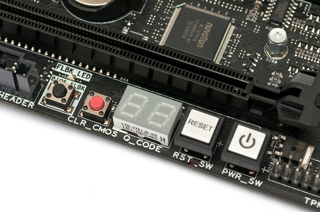 «Материнка» отлично приспособлена для эксплуатации в условиях открытого стенда. Например, снизу от разъема PCI Express 2.0 x16@x4 находится кнопка BIOS_FLBK, запускающая функцию обновления USB BIOS Flashback, клавиша Clear-CMOS, светодиодный индикатор кодов POST, а также кнопки включения и перегрузки.