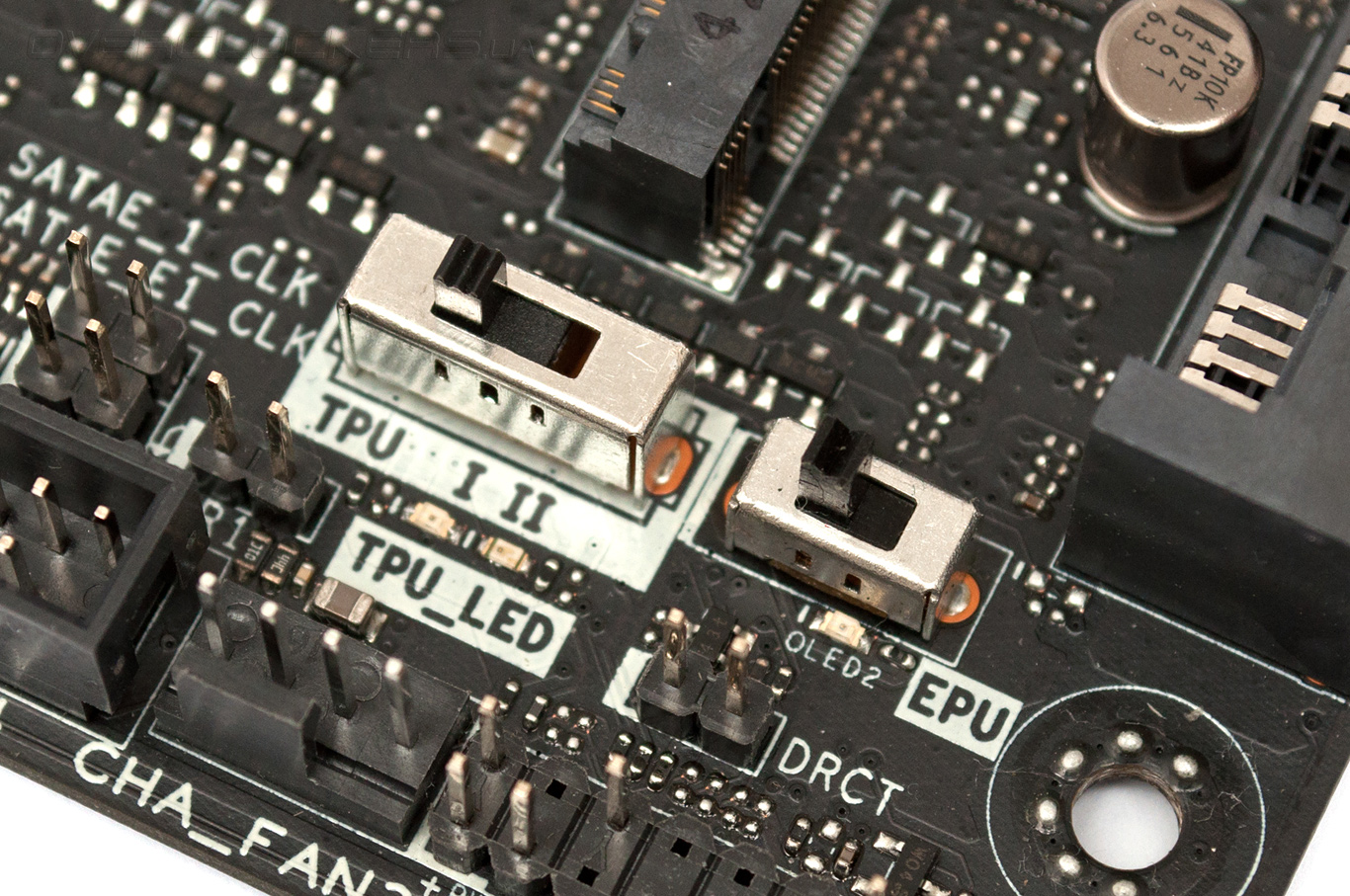 На правом нижнем крае системной платы расположены переключатели EPU и TPU. Первый включает фирменную технологию энергосбережения, а второй отвечает за активацию автоматического разгона. Рядом с переключателями находится двухконтактный разъем T_SENSOR1, к которому можно подключить внешний температурный датчик. Правда, последний в комплекте поставки отсутствует.
