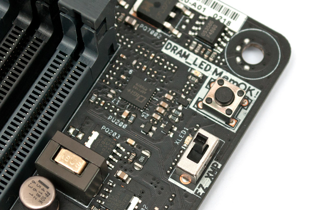 Рядом с разъемами оперативной памяти находится кнопка MemOK! и микропереключатель EZ_XMP, который позволяет активировать профили X.M.P. не входя в меню настройки.