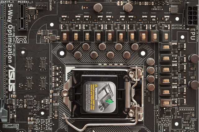 VRM материнской платы запитан от восьмиконтактного разъема, а сам преобразователь, формирующий напряжение VCCIN, построен по 16-канальной схеме. За его управление отвечает ШИМ-контроллер DIGI+ VRM ASP1257, в качестве силовых элементов используются традиционные MOSFET в количестве двух штук на каждую фазу.