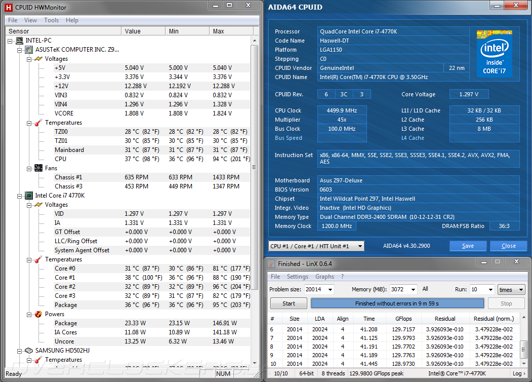 Во время изучения дизайна и прошивки мы с вами убедились, что ASUS Z97-Deluxe обладает мощным преобразователем напряжения и функциональным UEFI Setup, поэтому, от системной платы ожидались если не выдающиеся, то очень хорошие результаты разгона. Увы, реальность оказалось суровой... Мне не удалось поднять частоту тестового процессора Intel Core-i7 4770K выше 4500 МГц по причине банального перегрева. Несмотря на неоднократные попытки повторной установки кулера температурный датчик одного из вычислительных ядер упорно демонстрировал критические 96° С. При этом процессор балансировал на грани включения режима пропуска тактов, отчего напряжение Vcore пришлось ограничить на уровне 1,3 В. В это время модули ОЗУ работали на частоте 2400 МГц в соответствии с профилем X.M.P., тогда как Uncore-часть функционировала на штатных 3900 МГц, поскольку её разгон практически не влияет на итоговое быстродействие.
