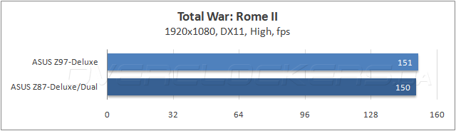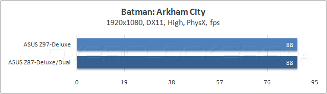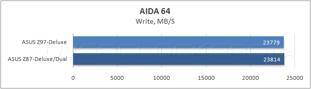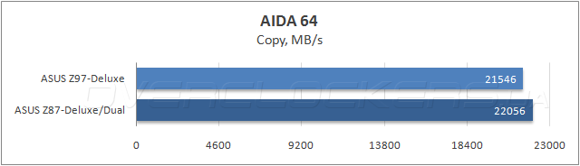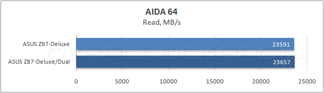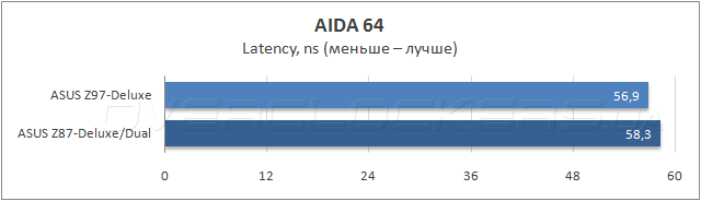 Результаты измерения пропускной способности ОЗУ в программе AIDA64 показали идентичность быстродействия обеих системных плат в операциях чтения и записи, и только при копировании данных модель ASUS Z87-Deluxe/Dual опередила новинку, зато, героиня сегодняшнего обзора показала меньшую латентность.