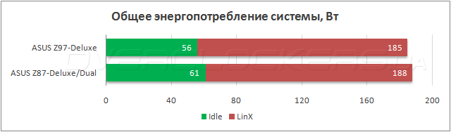 Системная плата ASUS Z97-Deluxe оказалась чуть лучше как при максимальной нагрузке, так и в режиме простоя. Разница, скорее всего, объясняется различными настройками прошивок, так как конструкция VRM у обеих «материнок» практически идентична.