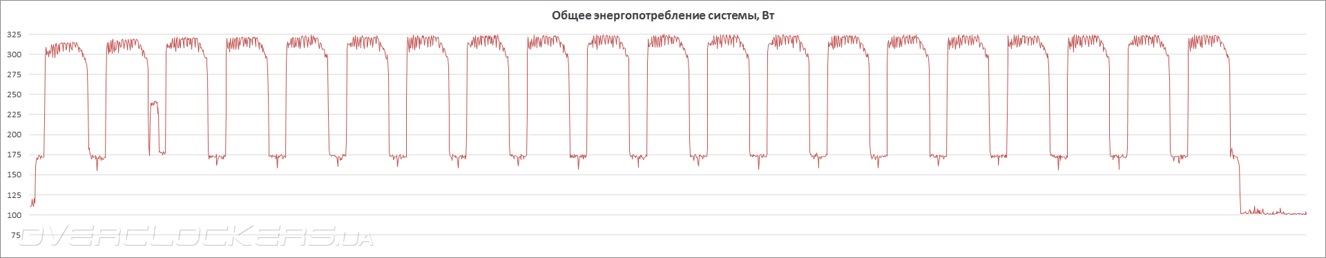 Замеры выполнялись после прохождения всех прочих тестов в «устоявшемся» режиме компьютера при помощи прибора собственной разработки. Методика заключалась в фиксации средневзвешенного значения потребления тестового стенда «от розетки» во время прохождения теста Prime95 с применением профиля In-place large FFTs а также при простое компьютера после завершения теста.