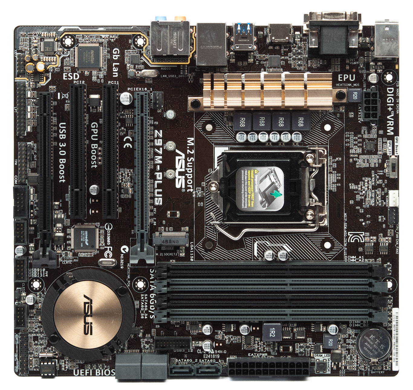 SATA-E отсутствует, но есть шесть чипсетных каналов SATA. Кроме них предусмотрен ещё и разъем M.2, отнимающий ресурсы у гнёзд SATA 5 и 6 (в случае его использования).