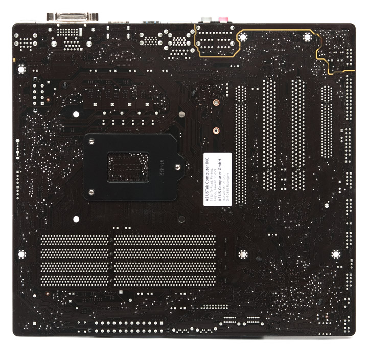 На обратной стороне платы электронные компоненты отсутствуют. Радиаторы зафиксированы простыми пластиковыми защёлками. У отверстий для закрепления системы охлаждения ЦП также нет ничего лишнего, поэтому размещение усилительной пластины прошло без проблем.