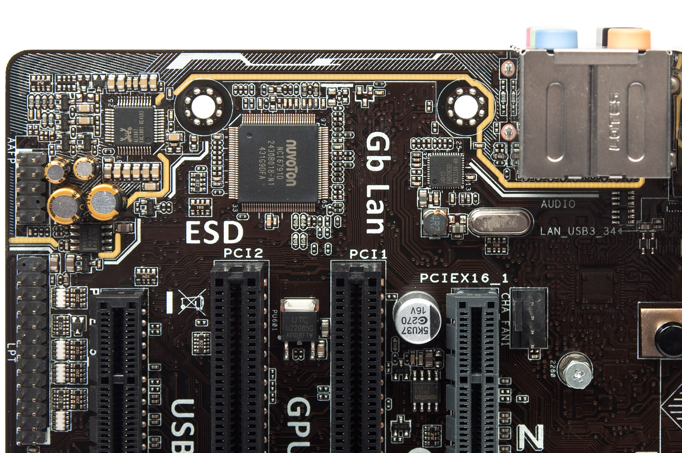 Серый слот PCI-E x16 предусмотрен для нужд видеоадаптера, а нижний, чёрного цвета, располагает ресурсами четырёх линий из состава Z97. Вдоль нижней грани находится обширное число колодок для подключения всевозможных периферийных устройств или удлинителей для них же.