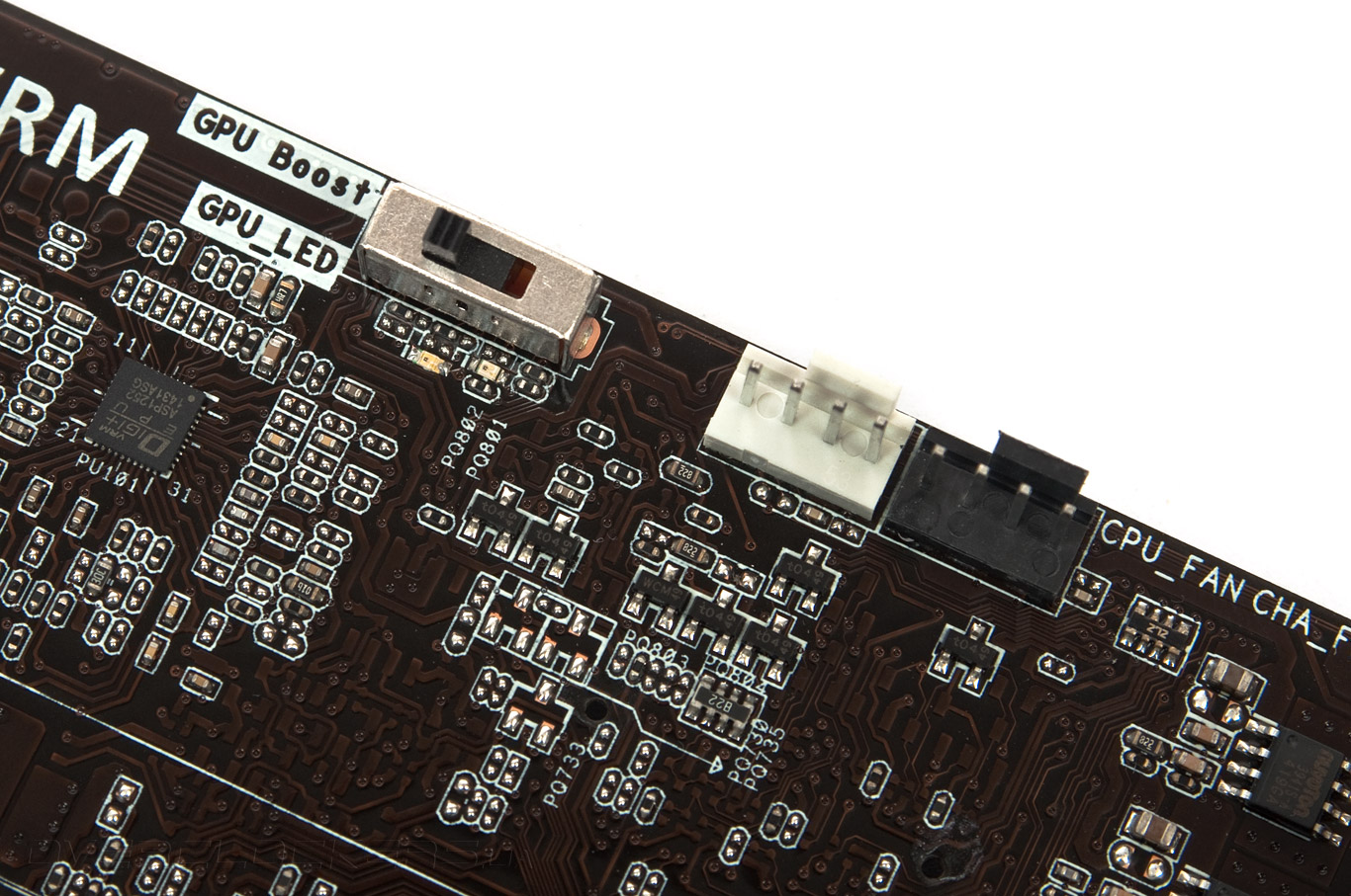 В верхней части платы распаян трёхпозиционный переключатель, а под ним находятся два разных светодиода. Подписан он как GPU Boost, однако роль его сводится к активации сценариев OC Tuner, что можно также сделать путём изменения настроек в UEFI, при этом разгоняется не только GPU от Intel, подробнее об этом будет сказано в обзоре разгонных возможностей.
