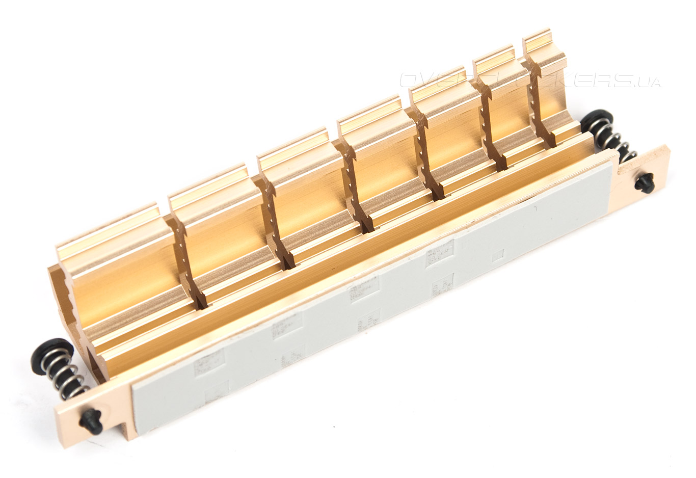 Радиатор немного изменён относительно упомянутых прежде сотоварищей, но общая идея осталась той же — это простой, лёгкий, неплохо продуваемый профиль. В который раз приходится удивляться экономии на площади используемой поверхности термопрокладки — её оказалось недостаточно для полного контакта со всеми силовыми элементами.
