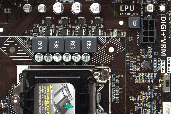 В области размещения подсистемы питания ЦП довольно просторно. Проблемы могут возникнуть только с массивными кулерами и одновременным использованием видеоадаптеров, оснащённых усилительными пластинами на обратной стороне устройства.