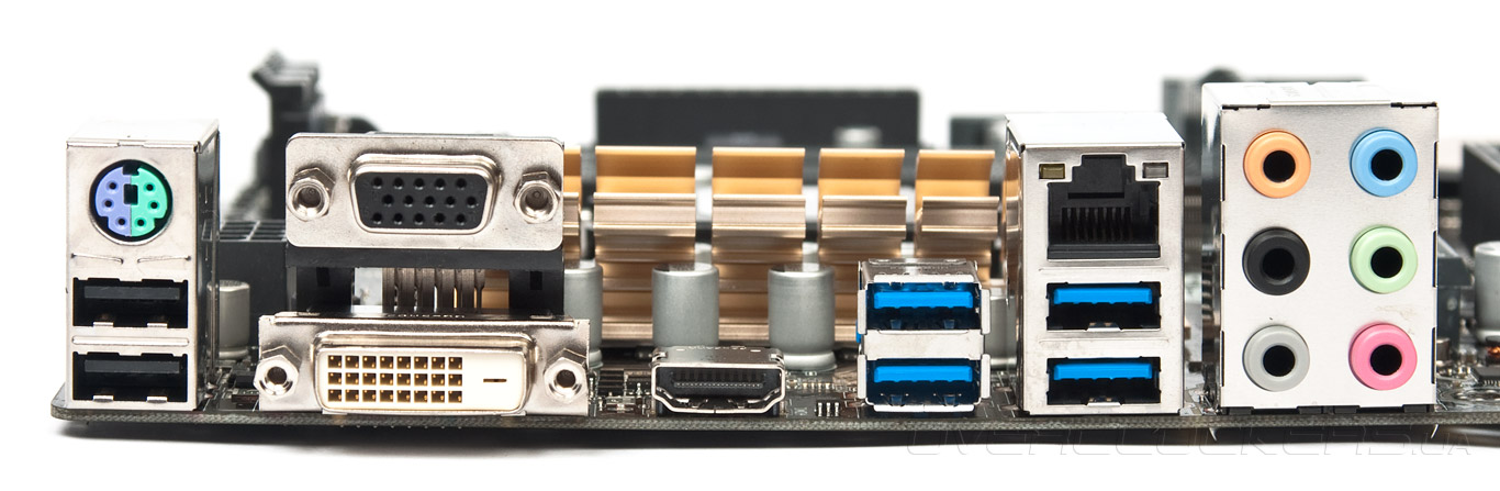 Задняя панель имеет вполне свойственный всем недорогим системным платам набор гнёзд. Однако у предшественника нашлось место для S/PDIF, а здесь от него решили отказаться. Выход HDMI дополнен конвертером уровней сигналов ASM1442.
