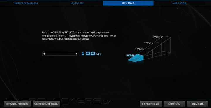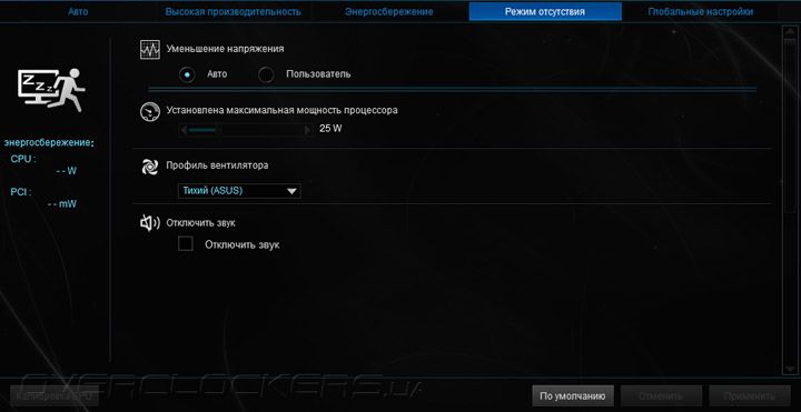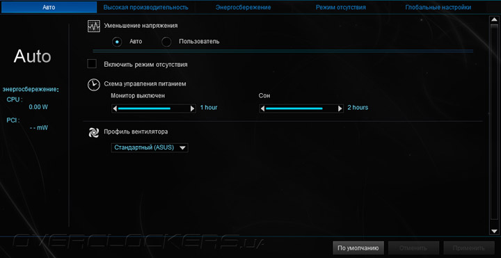 Традиционно доступен выбор и среди трёх готовых режимов, но они же доступны и в UEFI. В самом низу окна Ai Suite находится небольшой участок, где сосредоточены текущие показатели системных напряжений и температур, но не сказать, что он является информативным для наблюдения, к тому же до сих пор не исправлена досадная ошибка с именованием входящего напряжения ЦП, значащегося как параметр самого первого из вычислительных ядер.