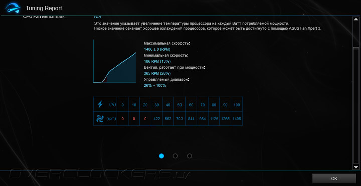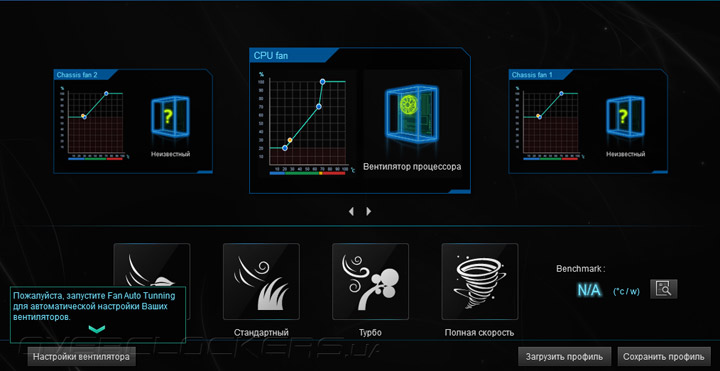 Нельзя не упомянуть о мастере по настройке вентиляторов. Всего к плате можно подключить три изделия. Одновременно для всех проходит процедура калибровки, после которой становится доступен индивидуальный паспорт для каждого, на основе которого можно выполнить выбор сценария функционирования охладителя.