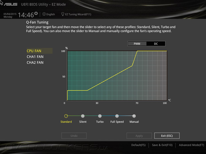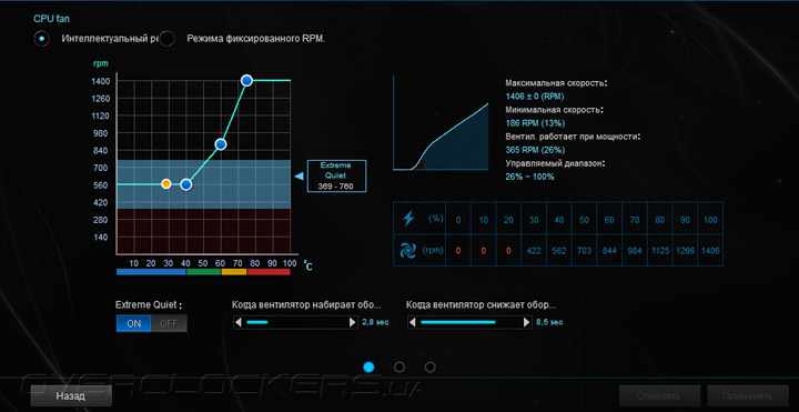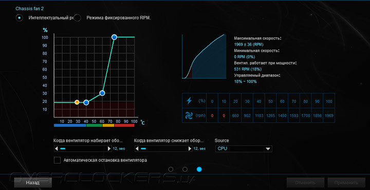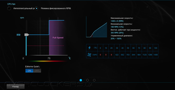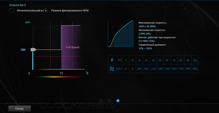 Всего варианта два — интерактивный режим и с фиксацией оборотов на единой отметке. Правда, при достижении отметки 75 °C (температуры ЦП) в последнем случае произойдёт переход на максимально возможные обороты устройства.