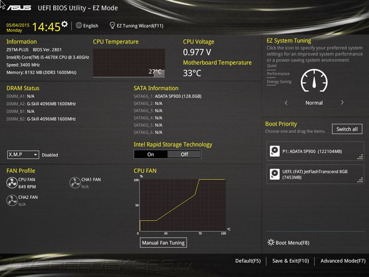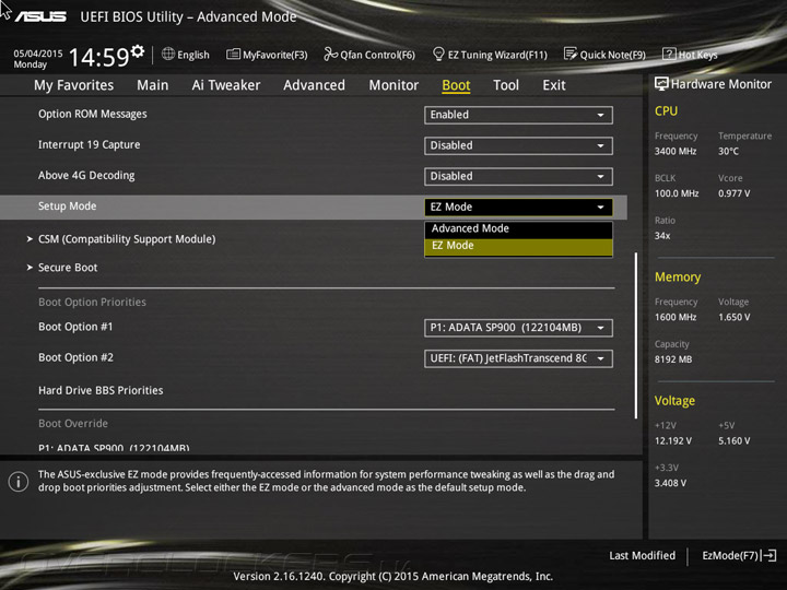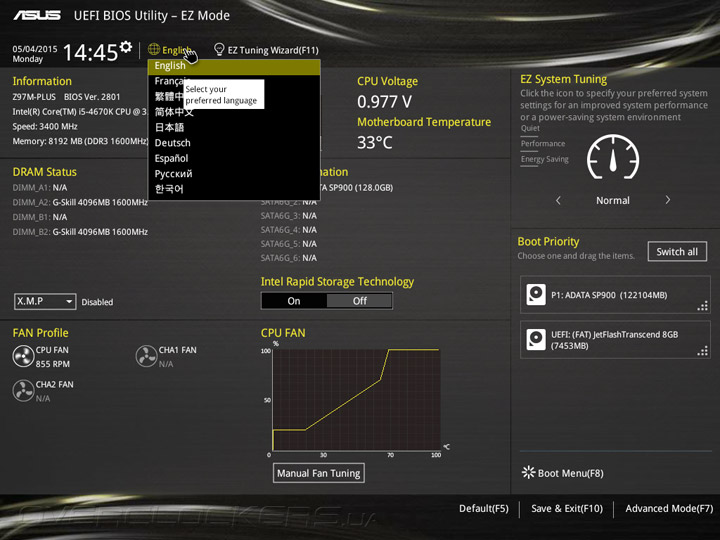Стартовое окно с настройками имеет название EZ Mode. Здесь можно установить правильные время и дату, выбрать необходимую локализацию интерфейса, активировать (при наличии) профиль XMP для ОЗУ, форсировать готовый профиль работы для охладителей. Кроме того, доступен для отображения список загрузочных устройств.
