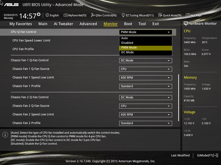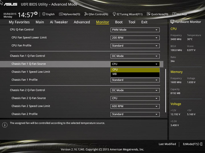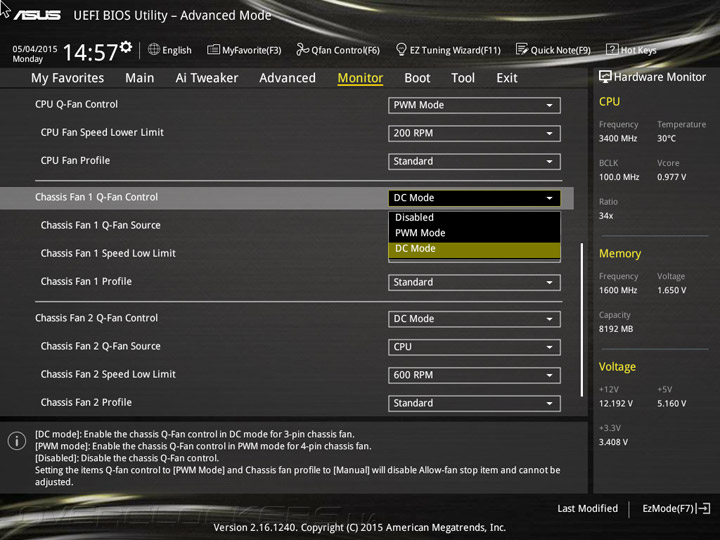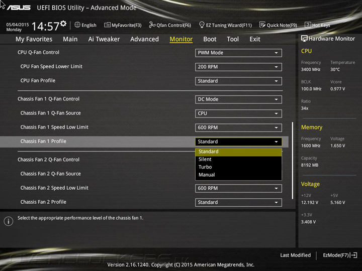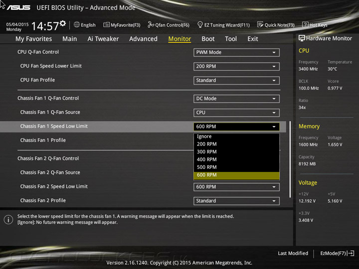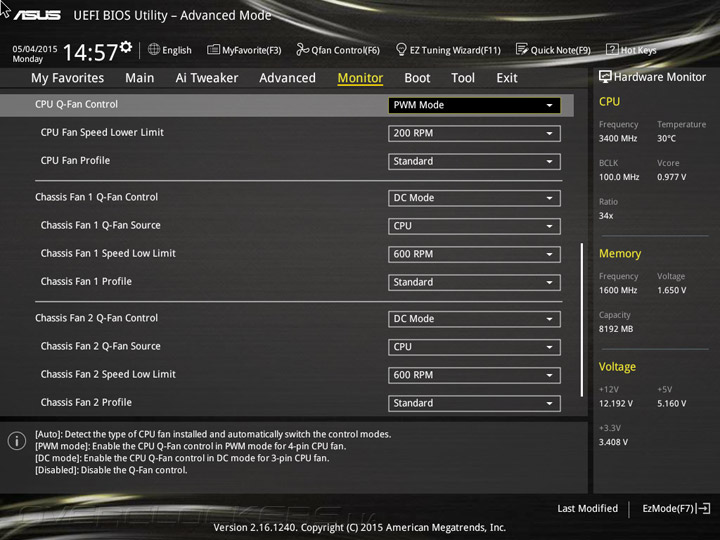 Раздел Monitor не такой насыщенный, как на иных устройствах. Группа основных отображаемых параметров неизменна, а вот число контролируемых вентиляторов мала — их всего три. Каждый из них может быть любого типа исполнения — трёх- или четырёхконтактный. Схем работы четыре, одна из них — настраиваемая. Но для этих целей лучше воспользоваться фирменным ПО.