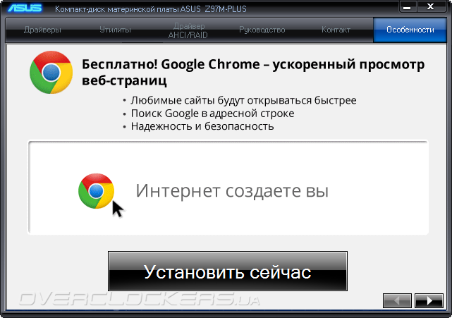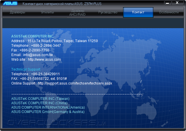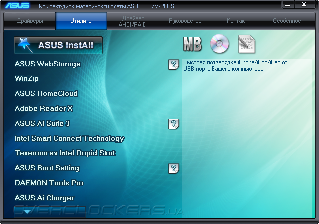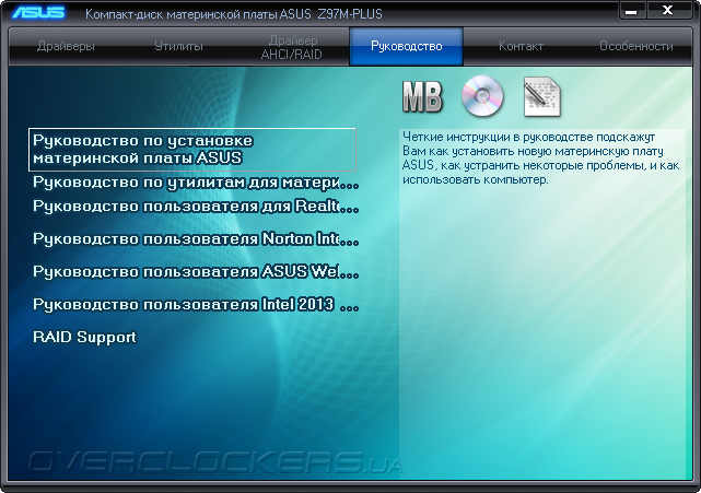 На сопровождающем плату диске находится набор из сопутствующих драйверов и утилит. Для обоих пунктов существуют мастера по установке ASUS InstAll.