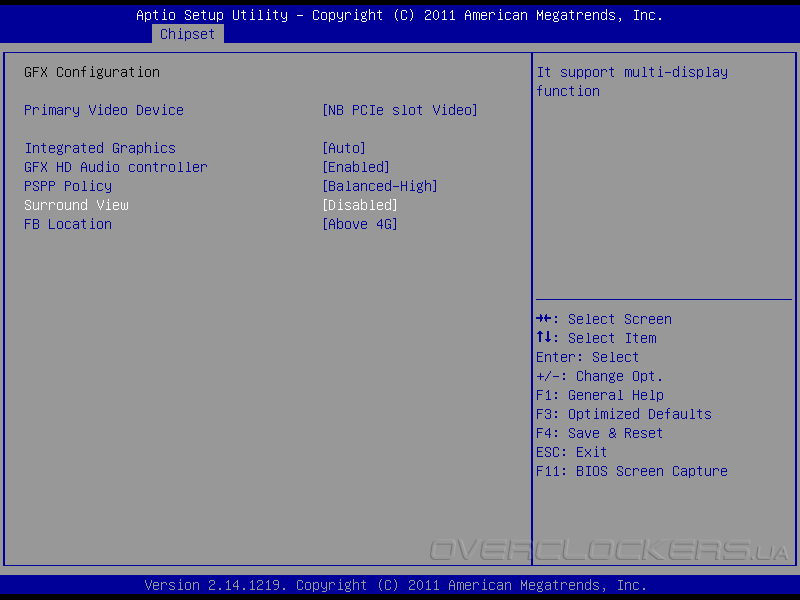 В следующей главе Chipset находится пункт меню GFX Configuration. В нем отчего-то по умолчанию выключена поддержка мультимониторных конфигураций. Еще один странный пункт, более актуальный для решений прошлых лет — FB Location. Мы не стали его ограничивать.