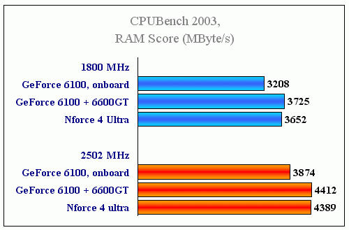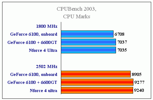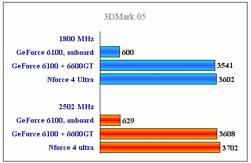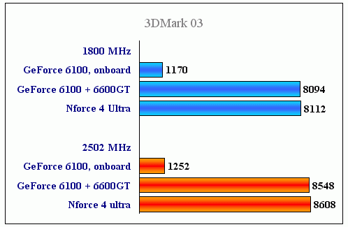 Что касается игровых тестов, то хоть 3DMark01 и зависит от скорости системы в целом, но это справедливо для более-менее быстрых видеокарт, а при использовании встроенной графики результат "уперся" именно в ее низкую скорость. Об этом говорит небольшой прирост от разгона процессора – всего ~400 баллов, в то время как с внешней видеокартой результаты после разгона выросли почти на 3000. Разница между платформами во всех 3DMark-ах опять же, минимальна, везде чуть быстрее Socket 939. Встроенное графическое ядро показывает низкую скорость в этих тестах (в 3DMark05 количество кадров в секунду ни в одном из тестов не превысило 3-х), и подходит оно только для довольно старых игр. Например, Need For Speed Underground в 1024*768 более-менее прилично "бегает" только на минимальных настройках качества в игре. Но стоит поставить внешнюю видеокарту, и система на базе GeForce 6100 показывает скорость, сопоставимую с более дорогой системой на nForce 4 Ultra, работающей в одноканальном режиме. Если говорить о качестве картинки, которую выдает встроенное ядро, то к нему претензий нет - на 19' ЭЛТ-мониторе SONY G420 в режимах 1280*1024 100Hz, 1600*1200 85Hz, а также на 17' ЖК-мониторе Samsung 730BF в 1280*1024 75Hz все выглядит отлично, нет никаких замыленностей или искажения цветов.