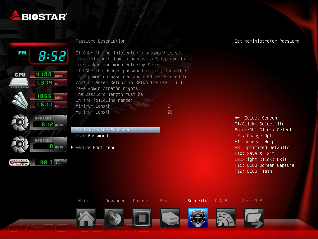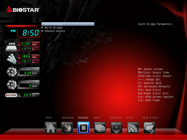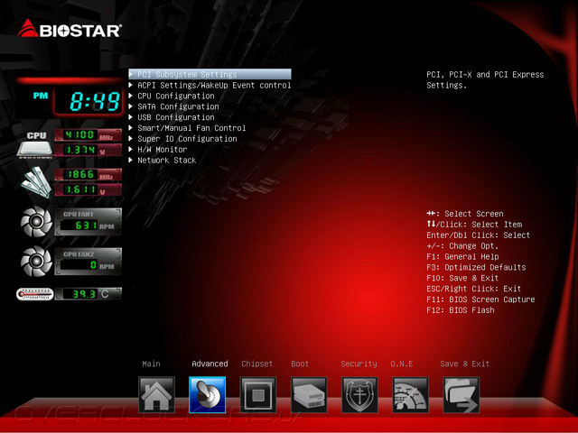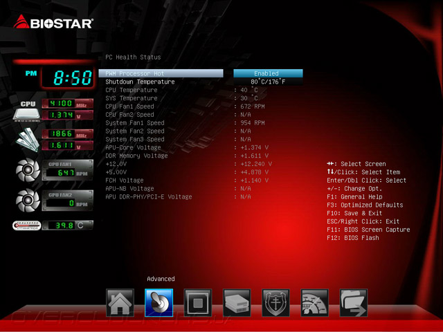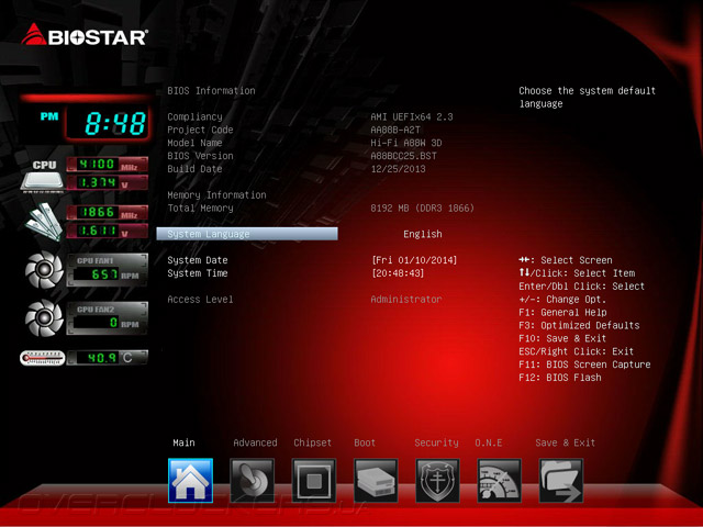 В основе прошивки системной платы лежит микрокод UEFI разработки AMI. Меню настройки Biostar Hi-Fi A88W 3D имеет оригинальный интерфейс, в левой части экрана отображается «приборная панель», на которую выводятся время, режимы работы ОЗУ и процессора, скорости вращения двух вентиляторов, а также температура APU. После входа в UEFI Setup открывается раздел Main, где отображаются подробности о прошивке, задаются дата и время.