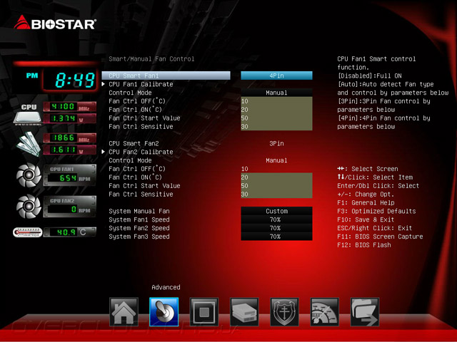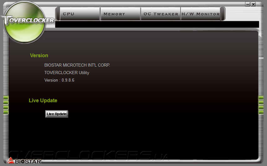 Если в части аппаратного обеспечения и стабильности прошивки системная плата Biostar Hi-Fi A88W 3D не вызвала особых нареканий, то качество комплектного ПО, увы, оставляет желать лучшего. Во-первых, у программ недружественные и совершенно неэстетичные интерфейсы, а во-вторых, их функциональность откровенно слаба. Например, рассмотрим утилиту Toverclocker, предназначенную для получения информации об установленных компонентах, управления быстродействием, системного мониторинга и настройки работы вентиляторов.