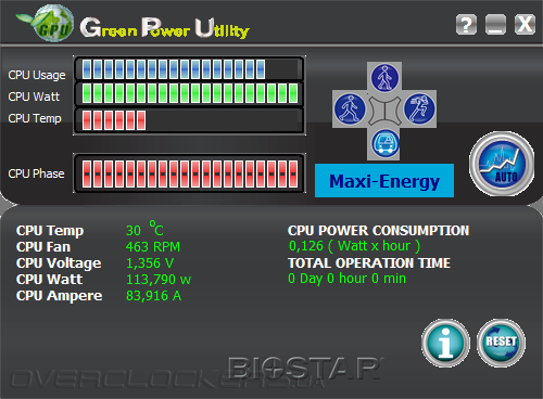 Для управления отключением неиспользуемых фаз VRM гибридного процессора служит программа G.P.U. — Green Power Utility. Главным её достоинством является отображение температуры, напряжения, силы тока и текущей потребляемой мощности APU, так что эта невзрачная утилита может пригодиться в процессе разгона.